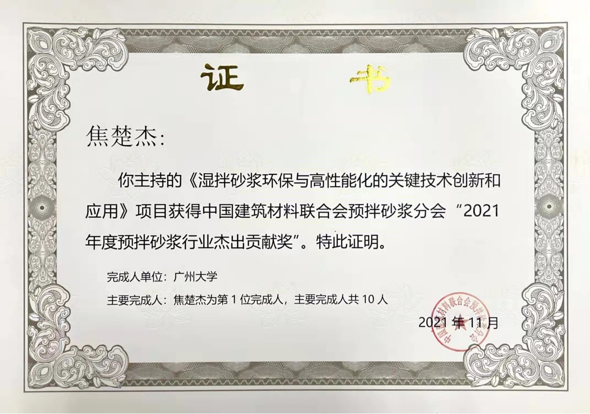 2021年11月1号,中国建筑材料联合会预拌砂浆分会发布公告,js555888金沙老品牌焦楚杰教授领衔的科技成果“湿拌砂浆环保与高性能化的关键技术创新和应用”获得了中国建筑材料联合会预拌砂浆行业杰出贡献奖,该成果包括五个方面:第一,砂浆流变学的“膜厚度理论”与试验方法革新,推动了砂浆流变学发展与砂浆生产技术进步;第二,粉体固废“浆体替代法”与绿色高性能砂浆研发,实现了固废的高效利用与水泥用量的显著降低,研发出环保与性能同步提升的砂浆,为固废资源化应用于绿色高性能砂浆开辟了新方向;第三,探明了纳米材料对再生玻璃粉砂浆微观结构、新拌性能、力学性能以及耐久性能的影响规律,为高性能再生玻璃粉砂浆的生产提供了新思路;第四,研发出抗裂、抗渗性能优异的砂浆,构建了三参数的砂浆收缩开裂模型和多因素耦合机制下的砂浆渗透模型,揭示了聚丙烯纤维和纤维素醚提高砂浆抗裂性能的机理,以及绿色高性能砂浆的渗流流量时变规律;第五,形成了绿色高性能砂浆配合比优化、绿色生产、施工全过程质量监控的成套技术。